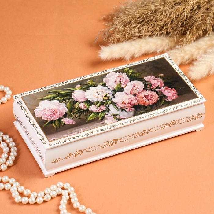 Шкатулка «Пионы», белая, 11×22 см, лаковая миниатюра