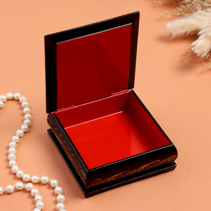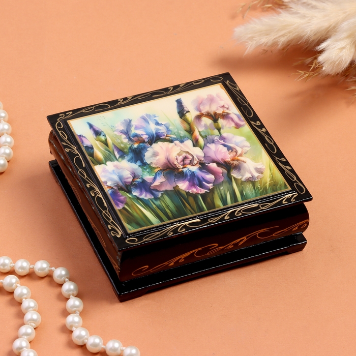 Шкатулка «Распустившиеся ирисы», черная, 10х10 см, лаковая миниатюра