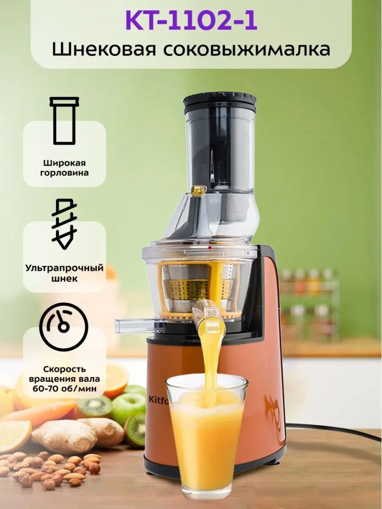 Шнековая соковыжималка Kitfort КТ-1102 позволяет отжимать максимально возможное количество сока из фруктов, овощей и зелени с сохранением всех его полезных компонентов: витаминов, аминокислот и минералов. Сок во время отжима не нагревается и не окисляется. Соковыжималка легко собирается и просто моется после работы.