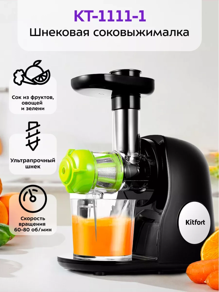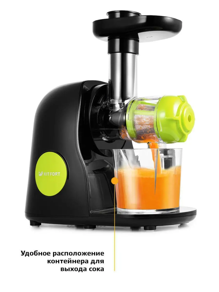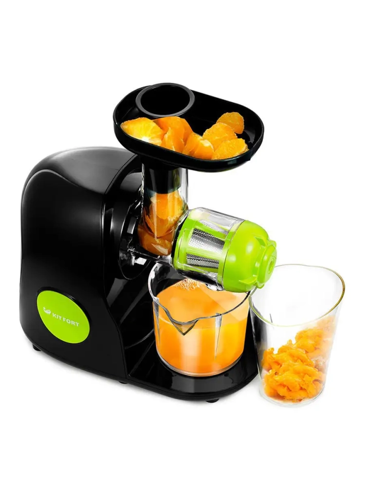 Шнековая соковыжималка Kitfort КТ-1111 позволяет отжимать максимально возможное количество сока из фруктов, овощей и зелени с сохранением всех его полезных компонентов: витаминов, аминокислот и минералов. Сок во время отжима не нагревается и не окисляется. Соковыжималка Китфорт легко собирается и просто моется после работы.
