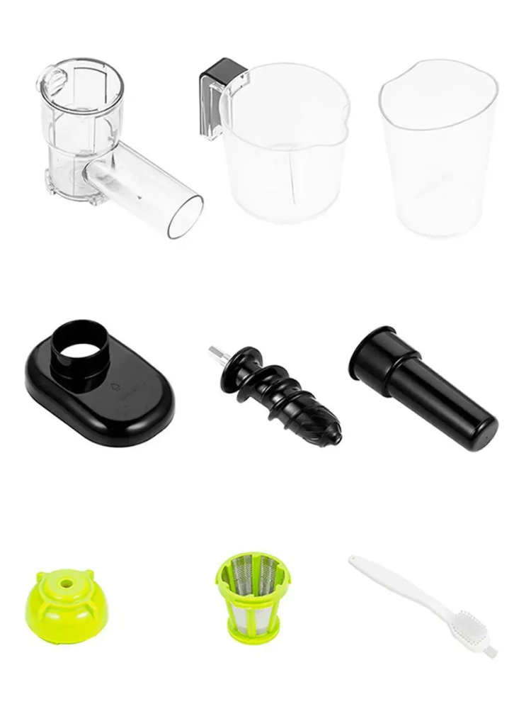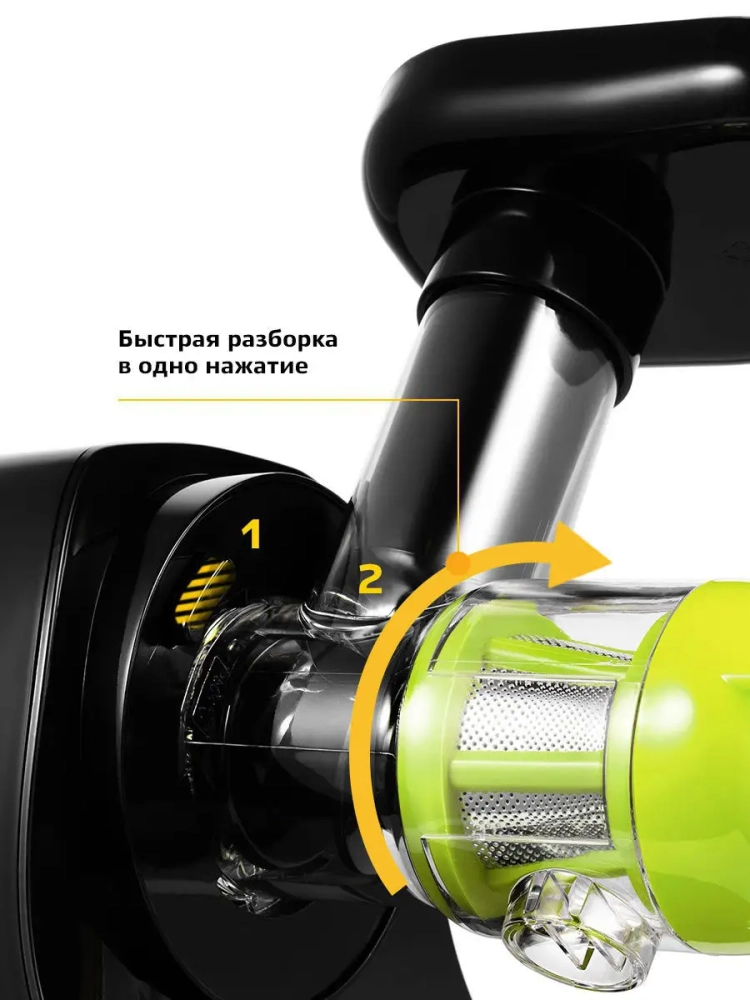 В отличие от обычной центробежной высокоскоростной соковыжималки, работающей при 1000-24000 об/мин и потребляющей до 1500 Вт электроэнергии, шнековая соковыжималка работает на низких скоростях вращения, около 60-80 об/мин, и потребляет всего 150 Вт. Однако, несмотря на малую скорость вращения, шнековая соковыжималка отжимает сок так же быстро, как и традиционная центробежная. Спиралевидный шнек-пресс из ультрапрочного материала дробит и прессует продукт, а затем продавливает мякоть через фильтр, отделяя жмых от сока. Эта технология позволяет сохранить гораздо больше питательных веществ, содержащихся в овощах и фруктах, и получить сок с высоким содержанием клетчатки и растительных ферментов, являющихся природными антиоксидантами.