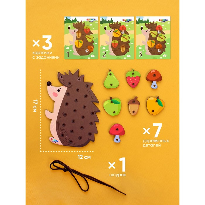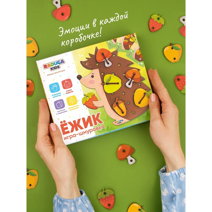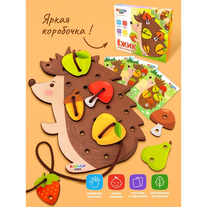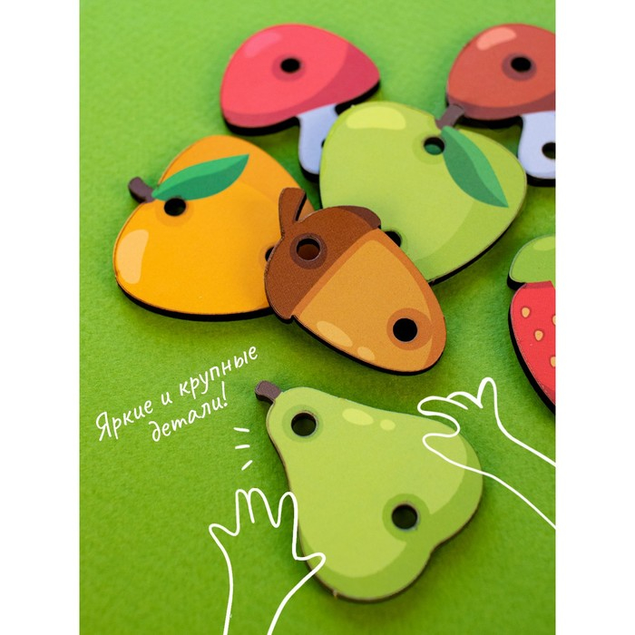 - Развивает мелкую моторику: работа с шнурком и деталями тренирует ловкость, координацию движений и точность пальцев.