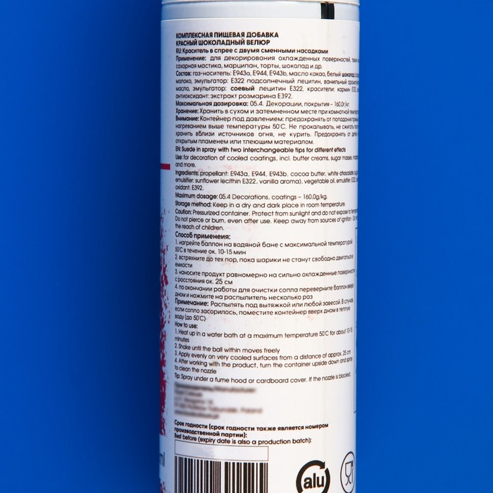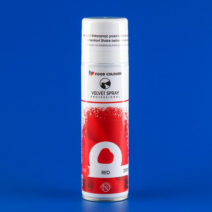 Перед использованием баллон должен находиться в теплом помещении в течение часа, и иметь температуру около 30С. Перед нанесением спрея-велюра кондитерские изделия должны быть охлаждены в морозильной камере и иметь температуру не выше минус 20С. Спрей наносить на поверхность торта на расстоянии 20 см при помощи коротких нажатий.
