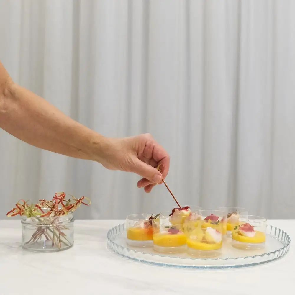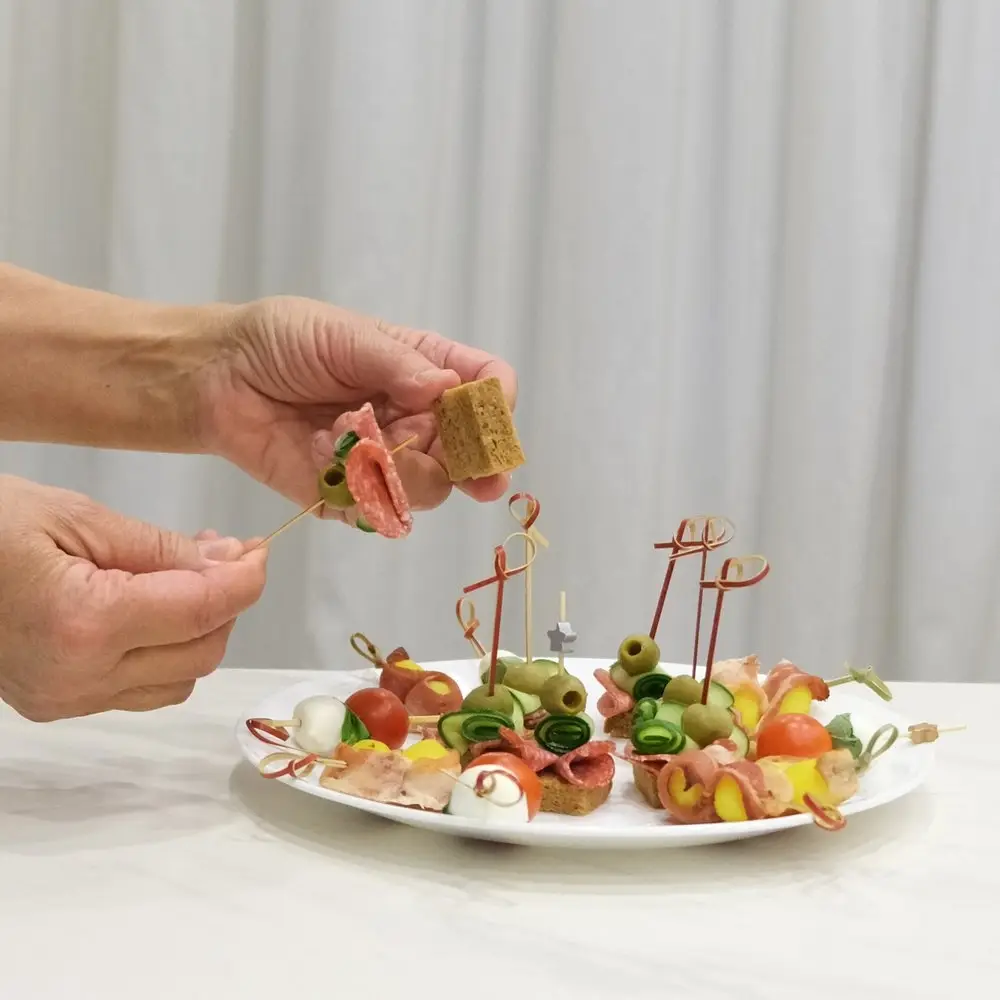 Шпажки используются при сервировке стола многослойными мини-бутербродами (канапе) из овощей, фруктов, ягод, сыров и мясных продуктов. Идеально подходят для фуршетов, вечеринок и праздников. Выбирайте любимые ингредиенты для приготовления порционных блюд, насаживайте их на шпажки и готовьте с удовольствием! Шпажки заменят десертные вилочки на вашем праздничном столе, а оригинальный дизайн поднимут настроение гостям. Шпажки предназначены для одноразового использования. Изготовлено: древесина (бамбук). Размер: общая длина шпажки 8 см.