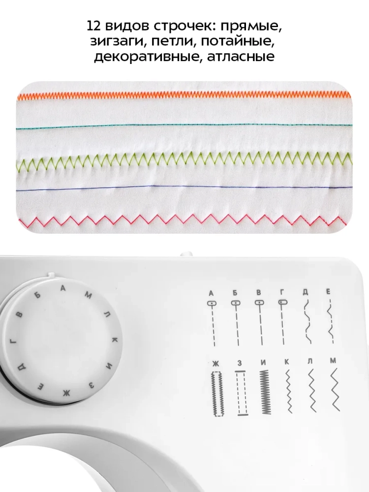 Данная швейная машина отличается простым, интуитивно понятным управлением, позволяющим работать с ней как опытным швеям, так и новичкам в шитье. Технические характеристики модели позволяют выполнять все стандартные швейные операции: прибор может выполнять 12 видов строчек, включая строчки для обработки петель для пуговиц. Также у устройства есть реверсный ход при шитье и возможность шить в автоматическом режиме. Благодаря подсветке рабочей поверхности глаза меньше устают во время работы.