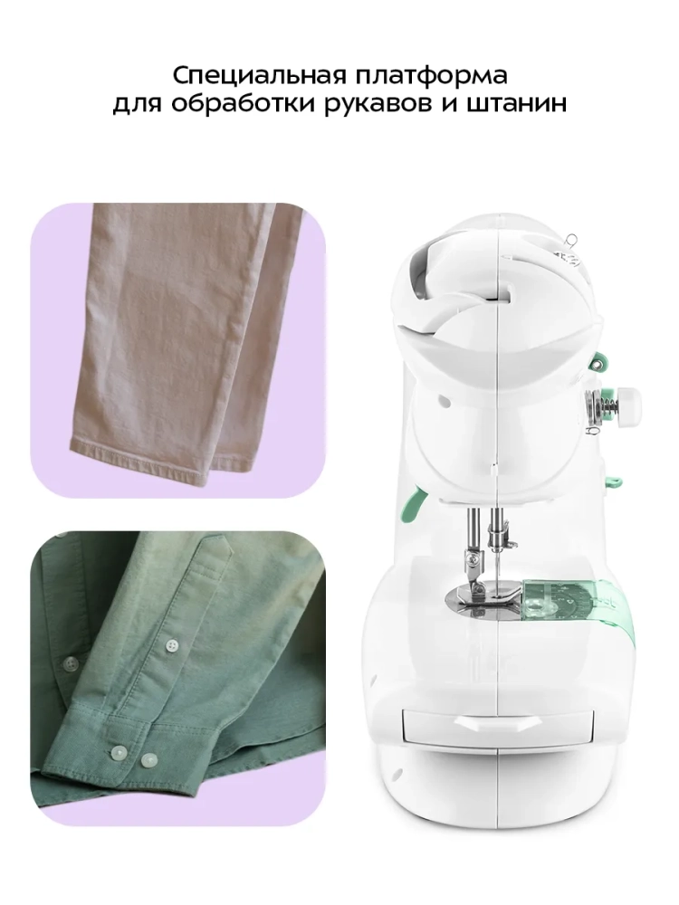 Портативная швейная машина КТ-6058 оснащена рукавной платформой, на которой удобно обрабатывать узкие детали одежды, например, манжеты рукавов, штанины и др.