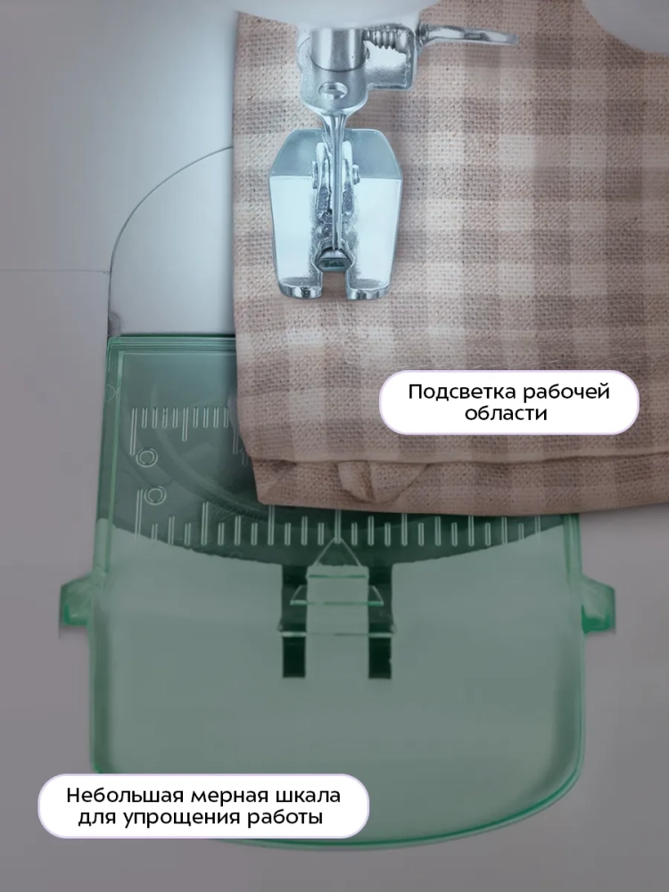 Данная швейная машина отличается простым, интуитивно понятным управлением, позволяющим работать на ней новичкам в шитье. Швейная машина прокладывает только прямую строчку, но благодаря регулировке натяжения нити подходит для работы с разными типами тканей. Также у устройства есть реверсный ход при шитье и возможность шить в автоматическом режиме без использования ножной педали. Благодаря подсветке рабочей поверхности глаза меньше устают во время работы. Сбоку машины есть отсек для хранения аксессуаров, в котором удобно хранить мелкие швейные принадлежности. Сверху на корпусе машины находится ручка для переноски. На крышку отсека шпуледержателя нанесена 4-сантиметровая линейная шкала для разметки небольших участков материала. Противоскользящие ножки снизу прибора обеспечивают устойчивость швейной машины во время работы.