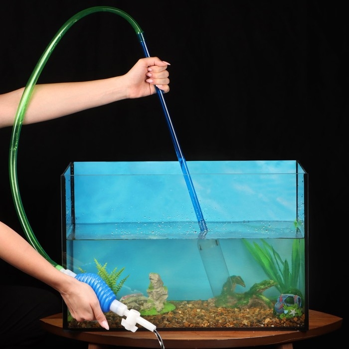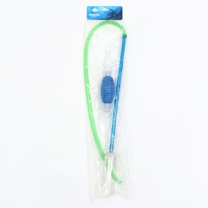 Аквариумный сифон удобен для ручного использования и обладает большой силой всасывания. Выполнен из пластика. У входного отверстия имеется сито внутри, которое собирает остатки корма и мусор с грунта. Чистит грунт и воду одновременно.