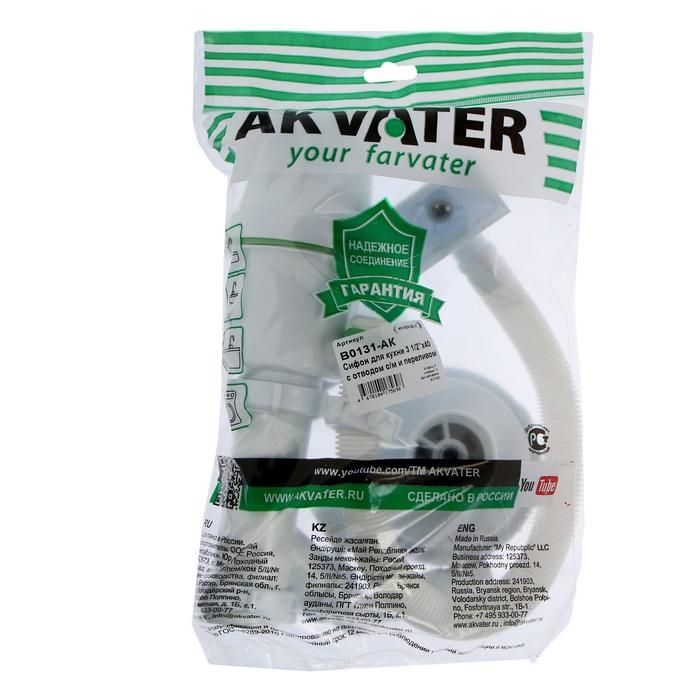 Сифон для мойки Akvater, 3 1/2" х 40 мм, прямоуг. перелив, с отводом для стиральной машины