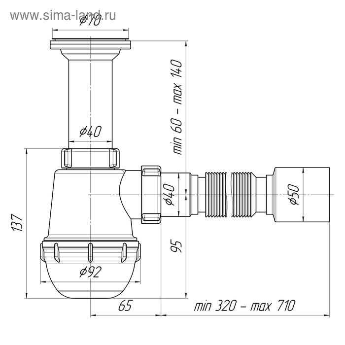 Сифон бутылочного типа с увеличенным корпусом предназначен для кухонных моек с диаметром сливного отверстия 50 мм. Он выполнен с литым выпуском и нержавеющей решёткой. Для подключения к канализации комплектуется гибкой трубой размером 40 × 50 мм.
