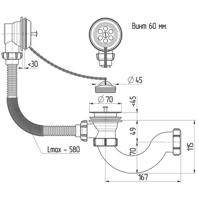 Сифон для ванны Akvater, 1 1/2"х40мм, выпуск и перелив, гофра 40х40/50мм, пробка без цепочки