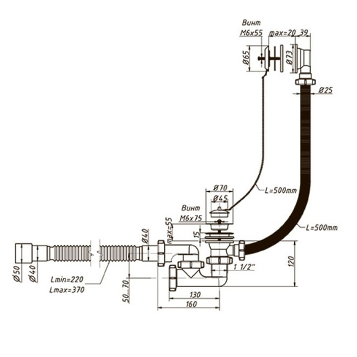Сифон для ванны ORIO А-80089, 1 1/2"х40/50 мм, регулируемый, перелив, с гофрой 40х40/50мм