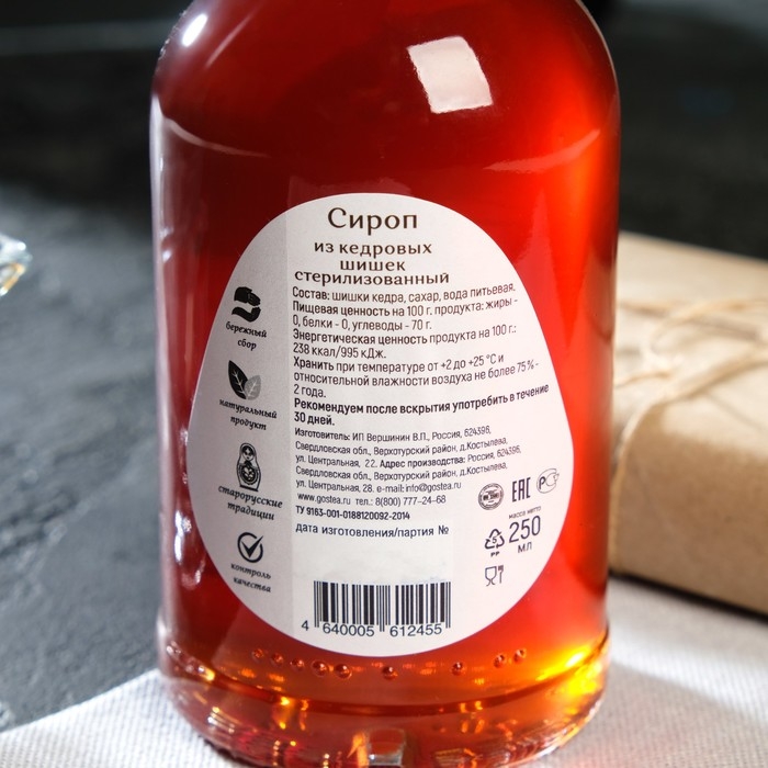 Состав: шишка кедра, сахар, вода питьевая, лимонная кислота, аскорбиновая кислота.