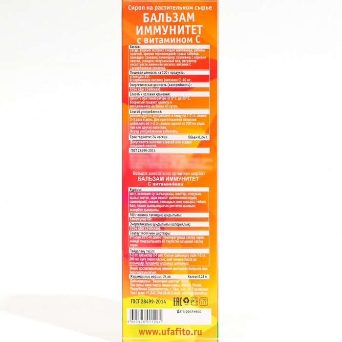 Состав: сахар, водный экстракт плодов шиповника, рябины красной, аронии черноплодной; травы чабреца, эхинацеи; слоевищ ламинарии; корневищ с корнями левзеи, солодки; мед натуральный; регулятор кислотности лимонная кислота; аскорбиновая кислота.