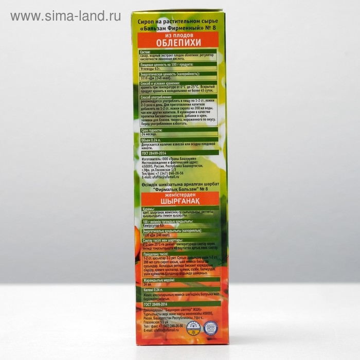 Состав: сахар, водный экстракт плодов облепихи; регулятор кислотности лимонная кислота.