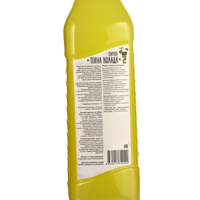 Сиропы "Черное море" изготовлены на основе смеси из натуральных и идентичных натуральным ароматизаторов, с пониженным содержанием углеводов (сахаров). В состав сиропа добавлен Л Карнитин - вещество, при недостатке которого в организме человека нарушается стабильное сжигание жиров. Уникальный состав сиропов способствует увеличению плотности молока и хорошему взбиванию при приготовлении молочных коктейлей. Готовый молочный коктейль долго сохраняет свою густую консистенцию. Сиропы отличаются своей термовыносливостью и не требовательностью к условиям хранения.