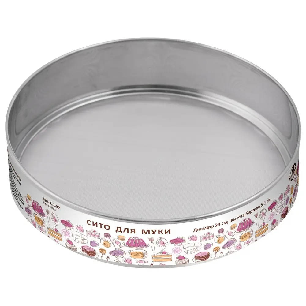 Сито — самое простое приспособление для просеивания муки, которое уже не одно столетие используется хозяйками. Просеивать муку следует для того, чтобы удалять из нее посторонние включения, насытить кислородом и разрыхлить. Из такой муки тесто становится более нежным, воздушным и легким. Выпечка поднимается быстрее, получается более красивой и ровной. Изделие состоит из стальной мелкоячеистой сетки и ободка, пользоваться им очень просто. После использования промойте сито в теплой воде, можно с жидкими моющими средствами и просушите. Диаметр 24 см, высота 5,5 см. Изготовлено из коррозионностойкой (нержавеющей) стали.