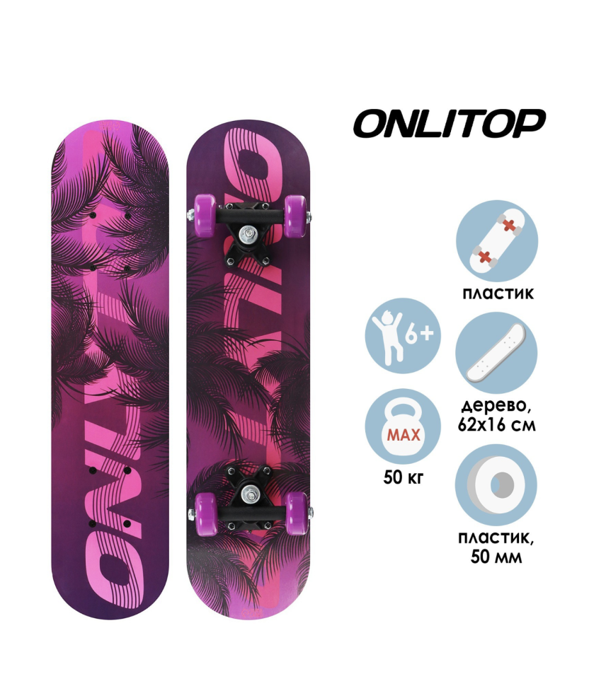 Скейтборд подростковый ONLITOP, 62×16 см, колёса PVC 50 мм, пластиковая рама