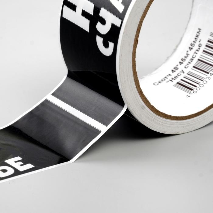 Клейкая лента с логотипом "Несу счастье" применяется в декорировании, используется для офисных и бытовых нужд, для упаковки подарков.
