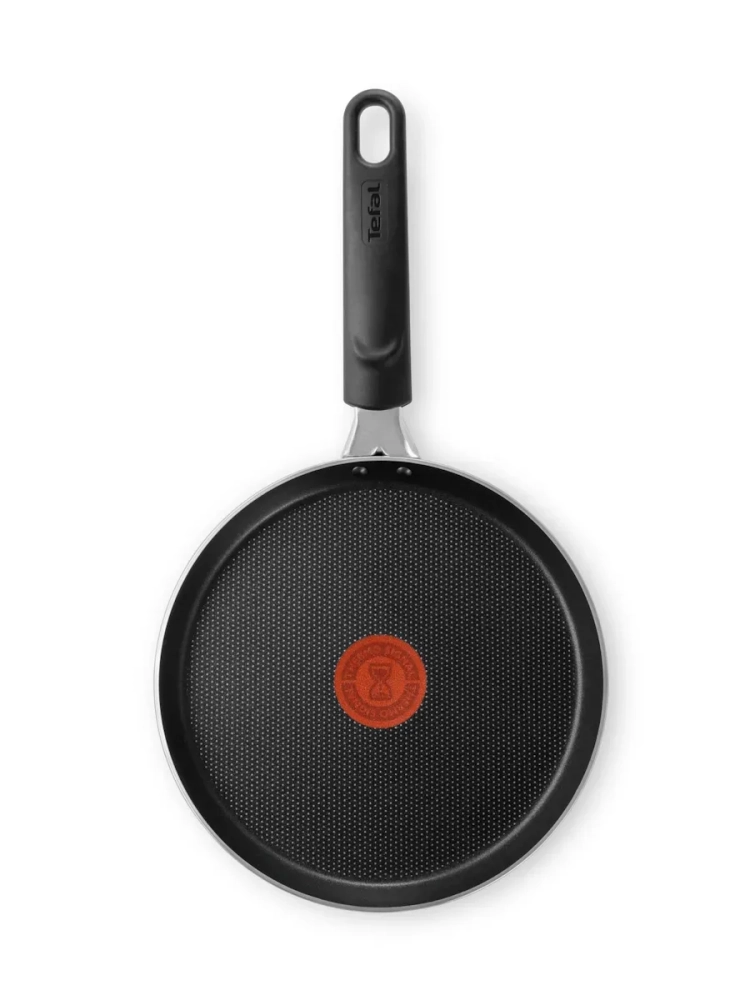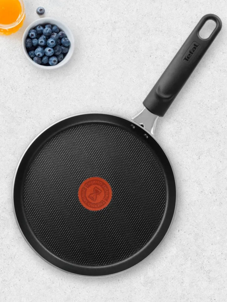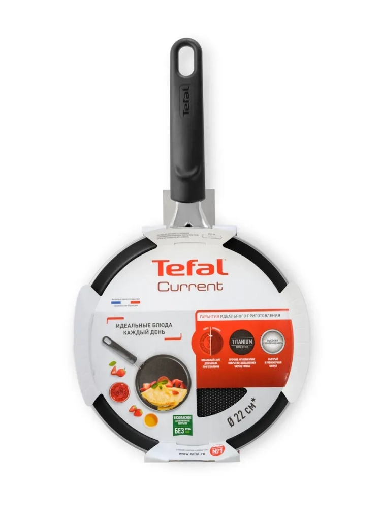 Блинная сковорода Tefal Current 22 cм, 04232522 сделает удобным и приятным ежедневное приготовление блюд для всей семьи. Вы действительно можете на нее рассчитывать: высококачественное антипригарное покрытие Titanium позволит готовить с минимальным количеством масла, а равномерное распределение тепла гарантирует идеальный результат: ажурные блинчики и пышные оладьи. Новый день – новый повод удивить родных и близких. Испытайте новую глубину вкуса приготовленных блюд. Сковорода подходит для всех типов плит, кроме индукционных. Индикатор нагрева становится темно-красным, когда сковорода достигает идеальной температуры для начала приготовления.