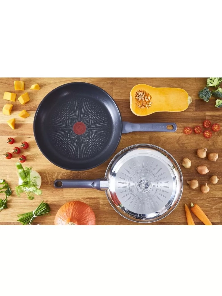 Готовьте так, как вам нравится: надежная, долговечная и удобная посуда для кухни имеет 10-летнюю гарантию на лучшее качество нержавеющей стали и экспертное производство. Заклепочное крепление ручки алюминиевой сковороды гарантирует надежное и безопасное использование сковороды, а антипригарное покрытие Tefal создано, чтобы служить безупречно при ежедневной эксплуатации. Благодаря титановым частицам поверхности, покрытие сохраняет отличные антипригарные свойства до 2-х раз дольше по сравнению с стандартным покрытием Tefal Titanium. Посуда подходит для использования на газовых, электрических, стеклокерамических и индукционных плитах. Уникальный индикатор температуры Thermo-Signal вовремя подскажет, когда кухонный инвентарь нагрелся до оптимальной температуры для начала приготовления.