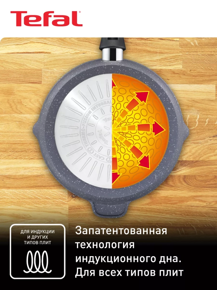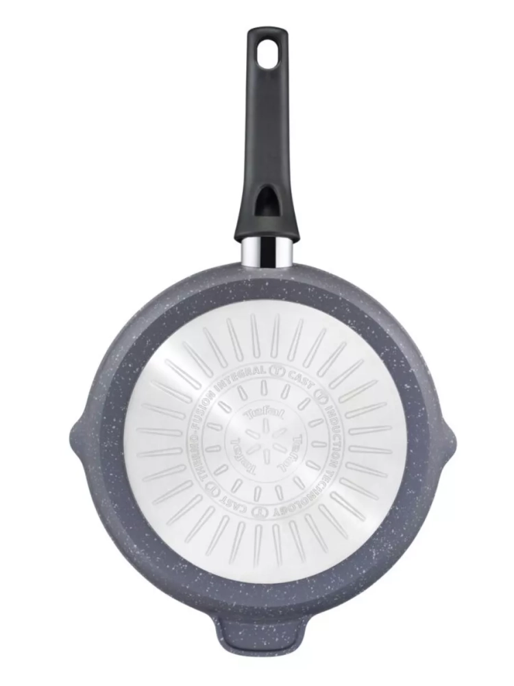 На изделие нанесено специальное покрытие Mineralia+, которое усилено минеральными частицами и гарантирует безупречные антипригарные свойства даже при готовке блюд без масла. Усовершенствованное индукционное ребристое дно Thermo-Fusion обеспечивает быстрый и равномерный нагрев сковороды, а индикатор Thermo-Signal путем изменения цвета покажет оптимальную температуру для начала приготовления. Также края посуды имеют специальную форму благодаря которым вы сможете с легкостью сливать лишнюю жидкость и предотвратить попадания брызг на рабочую поверхность.