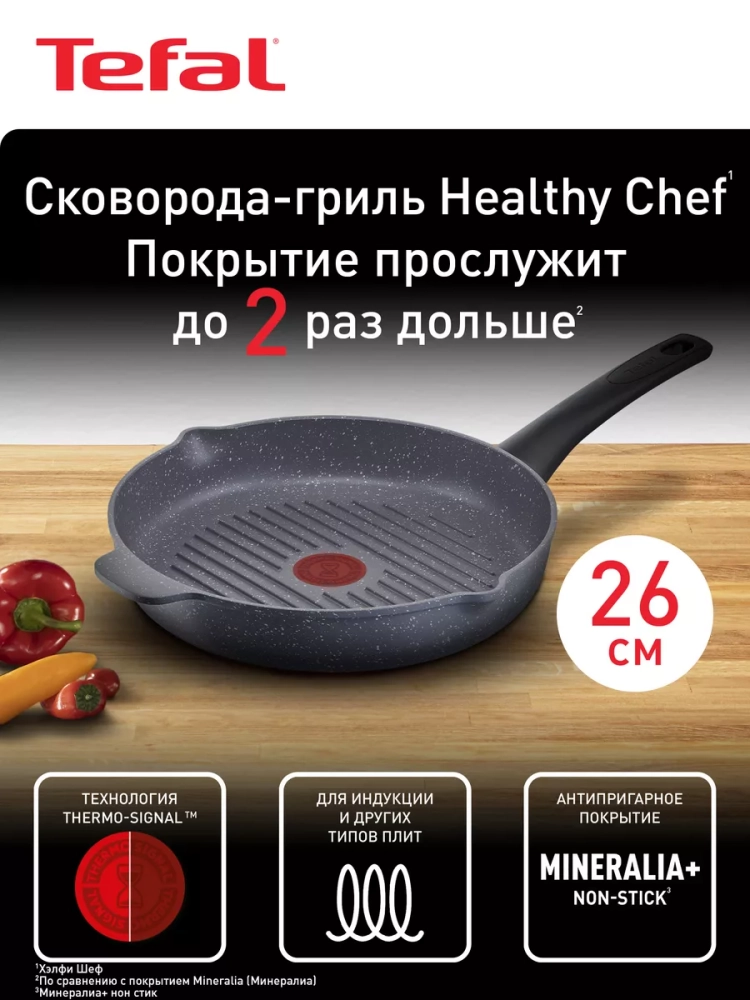 Сковорода-гриль Tefal Healthy Chef 26 см E2444055 создана для приготовления полезных и вкусных блюд каждый день.