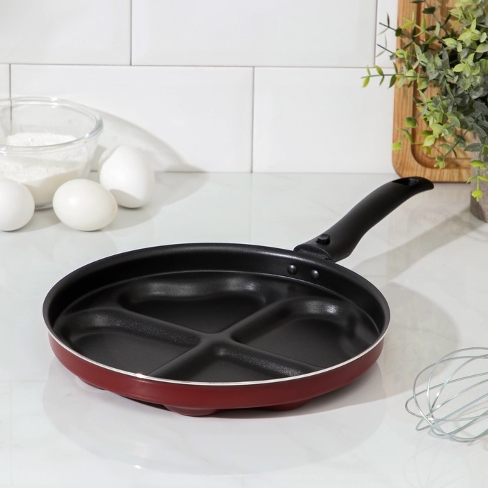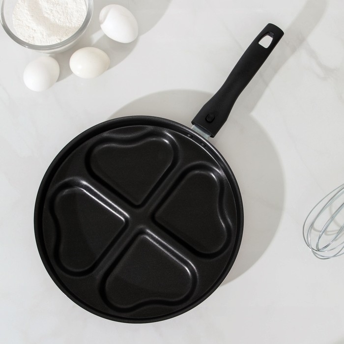 Аккуратные оладьи или воздушные блинчики в виде сердечек — теперь вы сможете вызывать восторг каждым своим блюдом, а сковорода Happy Heart, d=26 см, пластиковая ручка, антипригарное покрытие, цвет бордовый поможет вам в этом.