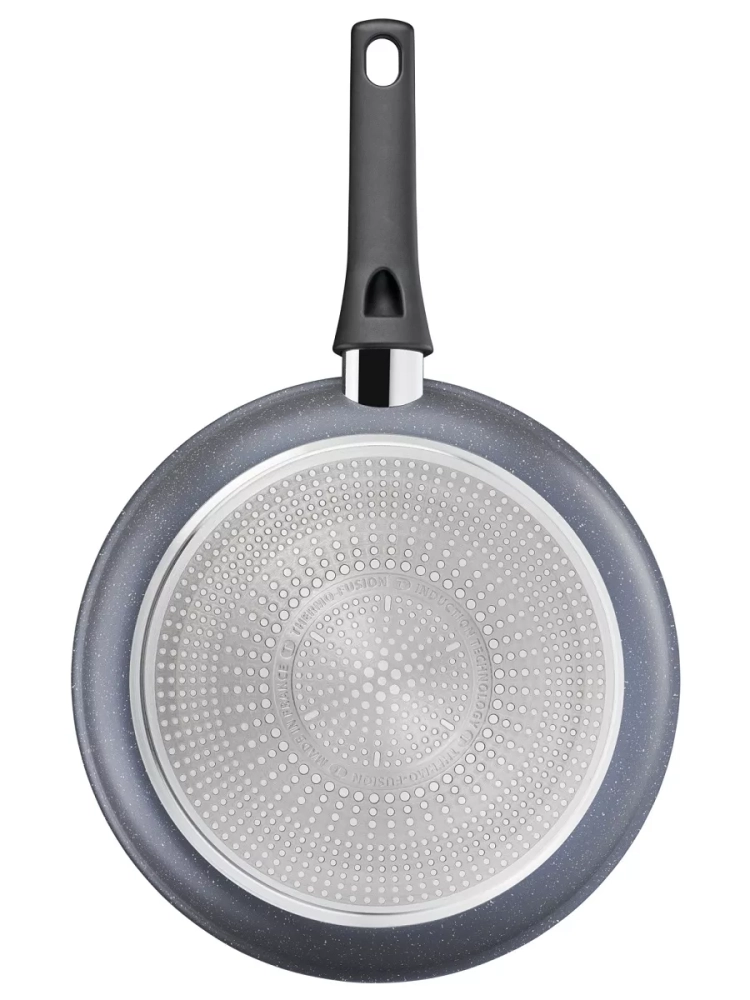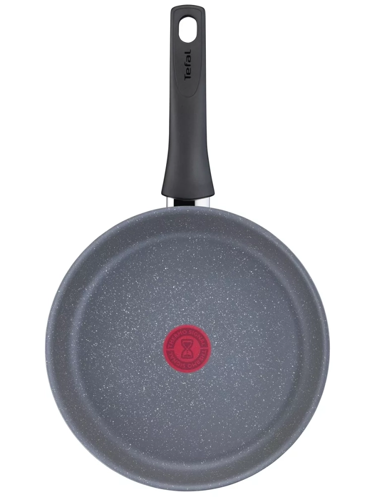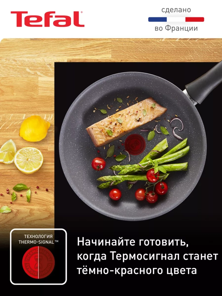 Главное преимущество сковороды из алюминия – антипригарное покрытие Mineralia+, усиленное минеральными частицами, что обеспечивает долговечность и превосходные антипригарные свойства, даже при жарке без масла, вы получите качественный результат. Кроме того, покрытие кухонного инвентаря абсолютно безопасно, так как производится без добавления PFOA, свинца и кадмия. Большая сковородка Тефаль оснащена инновационным индикатором температуры Thermo-Signal, который подскажет оптимальный момент для начала готовки, гарантируя идеальную текстуру и аппетитный внешний вид блюд, а индукционное дно Thermo-Fusion быстро и равномерно нагревает стенки по всей поверхности. Края посуды для дома имеют специальную форму для комфортного и точного слива лишней жидкости без брызг.