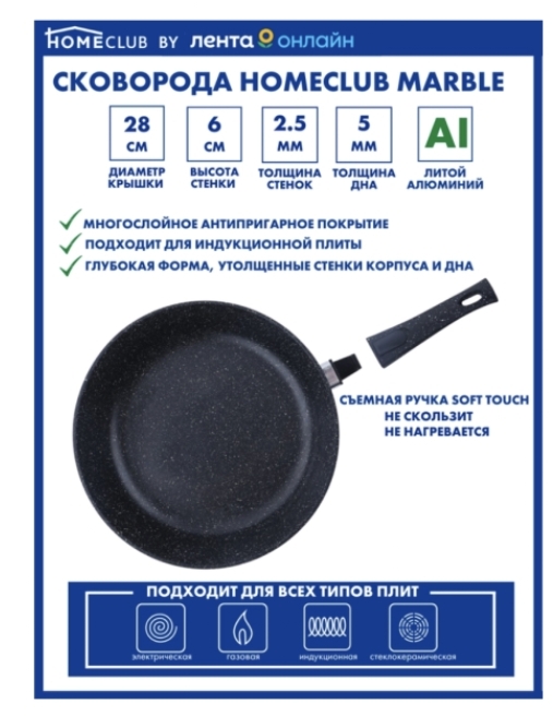 Сковорода HOMECLUB Marble 26см литая со съемной ручкой soft touch HC-26I-SR