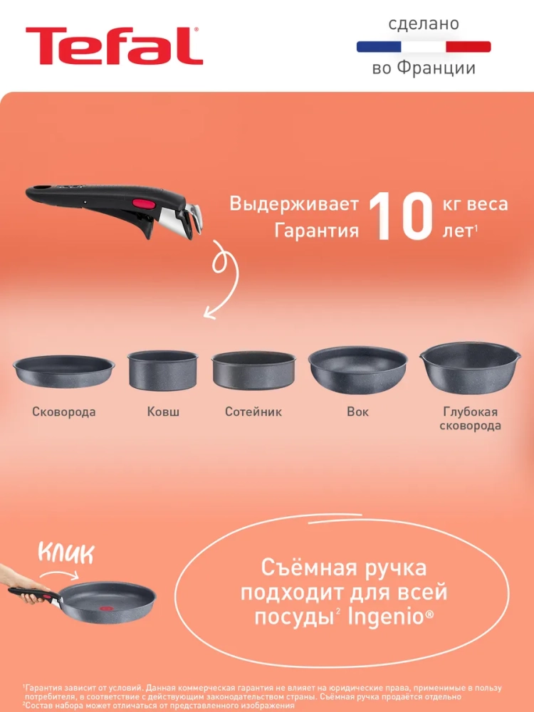 Антипригарное покрытие Mineralia+ усилено минеральными частицами, благодаря чему оно прослужит долго, и вы с легкостью сможете готовить полезные блюда без масла день за днем. Также алюминиевая сковородка оснащена специальным индикатором Thermo-Signal, который становится полностью красным, когда посуда для дома достигает оптимальной температуры для начала готовки завтрака или обеда. Усовершенствованное индукционное дно Thermo-Fusion гарантирует быстрый и равномерный нагрев всей поверхности кухонного инвентаря, каждый раз, обеспечивая безупречный результат жарки. Большая сковорода Тефаль подходит для использования на газовых, электрических, стеклокерамических и индукционных плитах. А антипригарное покрытие внутри и снаружи позволит с легкостью очищать посуду для кухни от остатков пищи после каждого использования. Кроме того, *съемная ручка, предназначена для частого и интенсивного использования: ее 3-ступенчатая система фиксации выдерживает вес до 10 кг и имеет 10-летнюю гарантию качества.