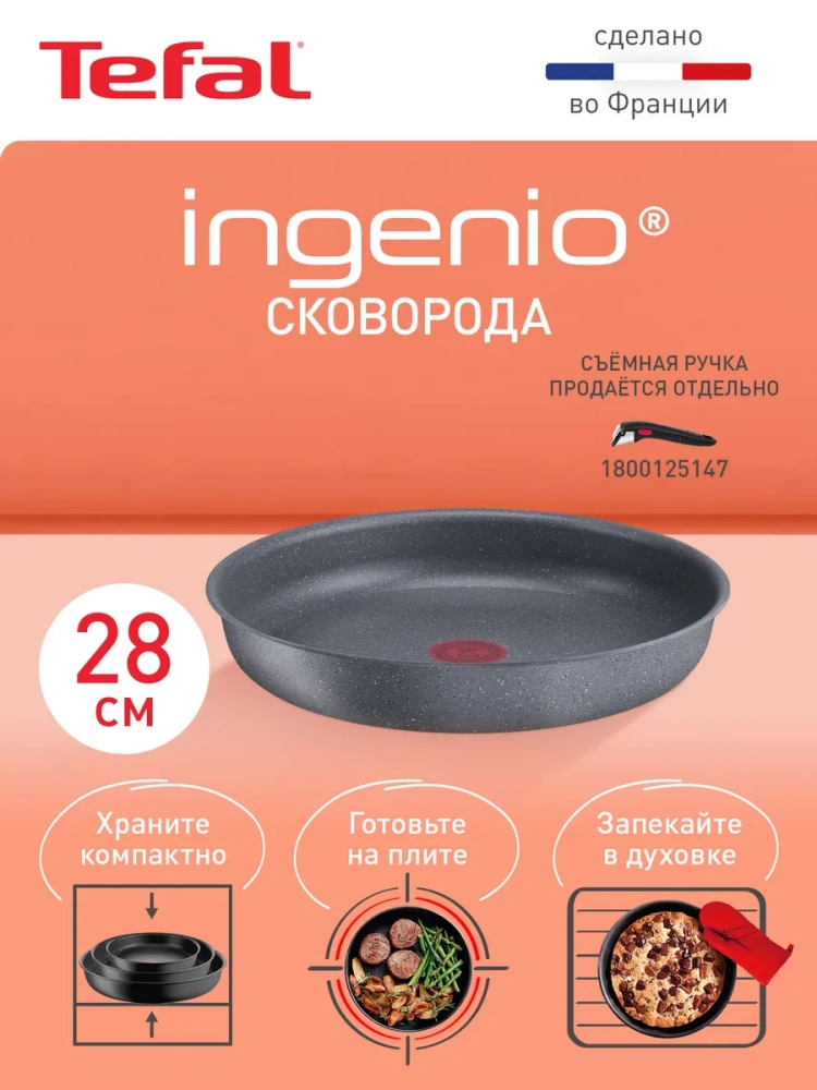 Антипригарное покрытие Mineralia+ усилено минеральными частицами, благодаря чему оно прослужит долго, и вы с легкостью сможете готовить полезные завтраки и обеды без масла день за днем. Также алюминиевая сковородка оснащена специальным индикатором Thermo-Signal, который становится полностью красным, когда посуда для дома достигает оптимальной температуры для начала готовки. Усовершенствованное индукционное дно Thermo-Fusion гарантирует быстрый и равномерный нагрев всей поверхности кухонного инвентаря, каждый раз, обеспечивая безупречный результат жарки. Большая сковорода Тефаль подходит для использования на газовых, электрических, стеклокерамических и индукционных плитах. А антипригарное покрытие внутри и снаружи позволит с легкостью очищать посуду для кухни от остатков пищи после каждого использования. Кроме того, *съемная ручка, предназначена для частого и интенсивного использования: ее 3-ступенчатая система фиксации выдерживает вес до 10 кг и имеет 10-летнюю гарантию качества.