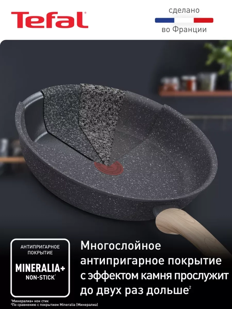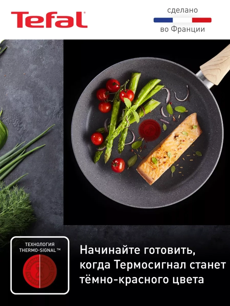 Антипригарное покрытие Mineralia+ усилено минеральными частицами, благодаря чему кухонный инвентарь прослужит долго, и вы с легкостью сможете готовить полезные блюда без масла день за днем. Также большая сковородка оснащена специальным индикатором Thermo-Signal, который становится полностью красным, когда изделие достигает оптимальной температуры для начала приготовления завтраков и обедов. Усовершенствованное индукционное дно Thermo-Fusion гарантирует быстрый и равномерный нагрев всей посуды для кухни, каждый раз, обеспечивая безупречный результат жарки. Сковородка Тефаль подходит для использования на газовых, электрических, стеклокерамических и индукционных плитах. А антипригарное покрытие внутри и снаружи позволит с легкостью очищать посуду от остатков пищи после каждого приготовления.