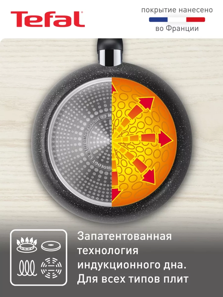 Алюминиевая сковорода Тефаль с ручкой произведена в соответствии с высочайшими стандартами безопасности и без применения PFOA, свинца и кадмия. Посуда для кухни совместима со всеми видами варочных панелей, включая индукционные плиты. А антипригарное покрытие кухонного инвентаря для приготовления пищи на наружной и внутренней поверхности облегчит не только процесс готовки, но позволит с легкостью очищать посуду, экономя ваше время.