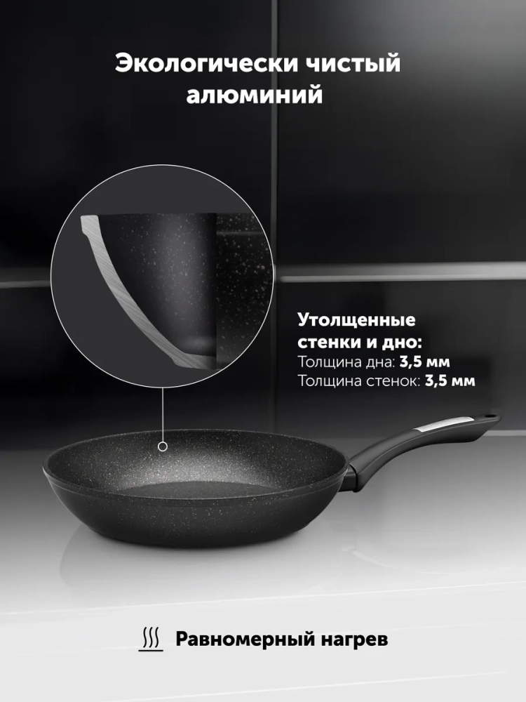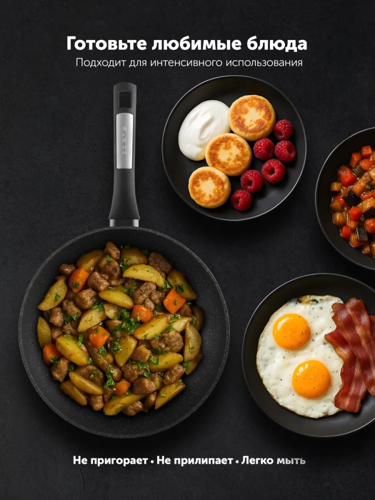 MICROсотовая структура внутренней поверхности обеспечивает равномерное распределение масла во время приготовления пищи и удерживает его на месте. Микрорельеф также предотвращает скапливание масла в одном месте, что может привести к перегреву и сгоранию продукта. Поэтому во время жарки вы гарантировано получите вкусное и прожаренное блюдо. Мясо, картофель, птица, омлет - что бы вы ни выбрали, получится идеально! Благодаря размеру 20 см на ней удобно приготовить яичницу и другие блюда на завтрак.