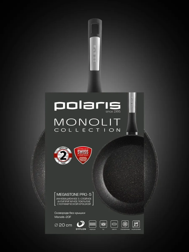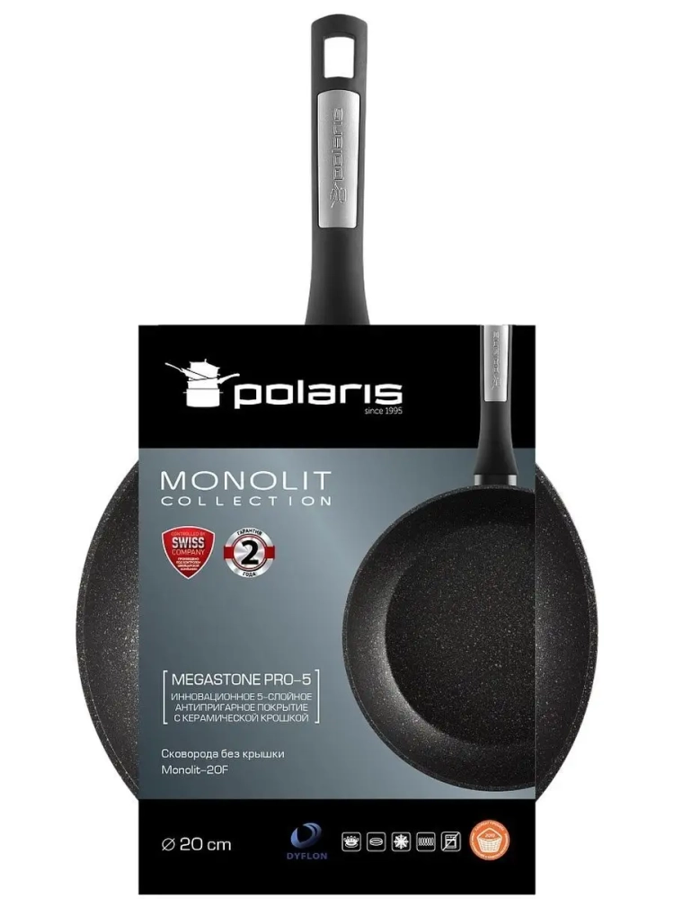 Polaris Monolit-20F - это сковорода, которая создана в соответствии с последними тенденциями и требованиями к профессиональной современной посуде. Она полностью соответствует европейским стандартам качества и безопасна для использования. Изделие выполнено из высококачественного кованого алюминия, который отлично показывает себя в эксплуатации, намного прочнее и долговечнее, чем эмалированная посуда и посуда из нержавеющей стали. Благодаря инновационному 5-слойному антипригарному покрытию с керамической крошкой MEGASTONE PRO-5 от компании Dyflon, сковорода устойчива к механическим повреждениям, царапинам и надолго сохранит первозданный внешний вид. Термостойкое внешнее покрытие обеспечивает максимальную защиту поверхности сковородки от образования нагара.
