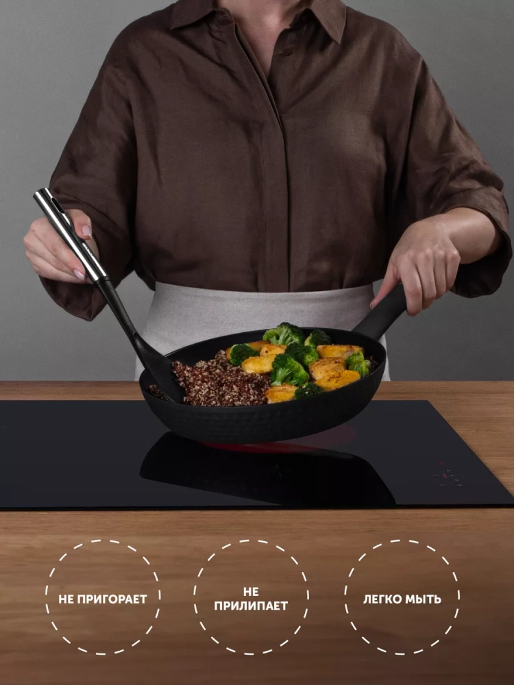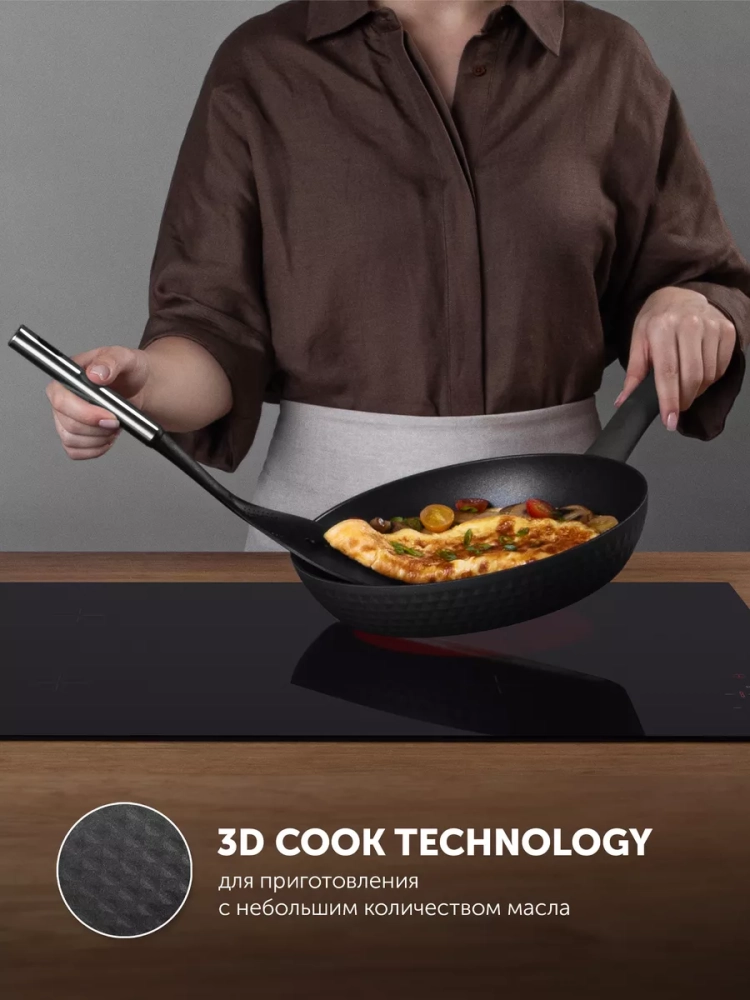 Универсальная сковорода станет идеальным выбором для приготовления вкусной и здоровой пищи, ведь благодаря технологии 3D COOK (рифленая поверхность дна) вы сможете готовить блюда с низким содержанием жира и масла, сохраняя их натуральный вкус. Прекрасно подходит для жарки и тушения мяса, птицы, картофеля и других продуктов.