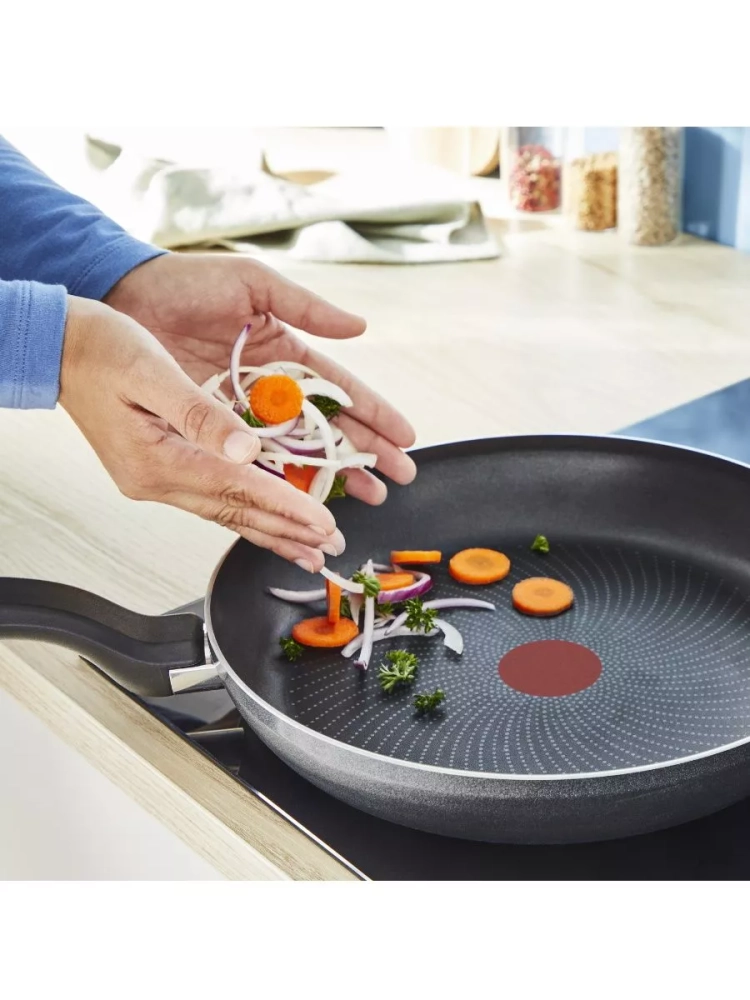 Благодаря новейшей технологии Light Tech посуда для кухни на 43% легче по сравнению с классической серией алюминиевых сковород Tefal. Также изделие совместимо со всеми видами плит, включая индукционные, посуда для дома мгновенно нагревается, а блюда готовятся намного быстрее. Высококачественное покрытие Titanium non-stick с добавлением титана обладает отличными антипригарными свойствами, сохраняя ценные питательные вещества и неповторимый вкус ингредиентов. Усовершенствованный индикатор нагрева Thermo-Signal меняет цвет, когда металлическая сковородка с ручкой достигает оптимальной температуры для начала приготовления завтраков и обедов, поэтому вы с легкостью сможете достигать идеальных результатов жарки день за днем. А эргономичная ручка посуды Тефаль позволит удобно держать и перемещать маленькую сковороду в процессе готовки.