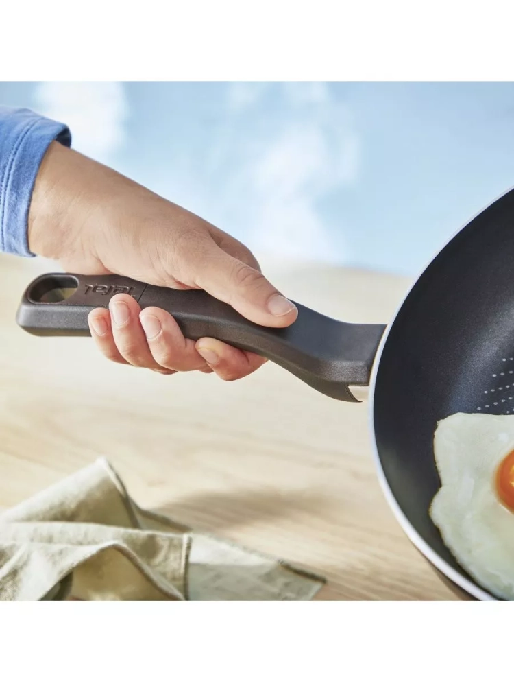 Благодаря новейшей технологии Light Tech посуда для кухни на 43% легче по сравнению с классической серией алюминиевых сковород Tefal. Также изделие совместимо со всеми видами плит, включая индукционные, посуда для дома мгновенно нагревается, а блюда готовятся намного быстрее. Высококачественное покрытие Titanium non-stick с добавлением титана обладает отличными антипригарными свойствами, сохраняя ценные питательные вещества и неповторимый вкус ингредиентов. Усовершенствованный индикатор нагрева Thermo-Signal меняет цвет, когда металлическая сковородка с ручкой достигает оптимальной температуры для начала приготовления завтраков и обедов, поэтому вы с легкостью сможете достигать идеальных результатов жарки день за днем. А эргономичная ручка посуды Тефаль позволит удобно держать и перемещать большую сковороду в процессе готовки.