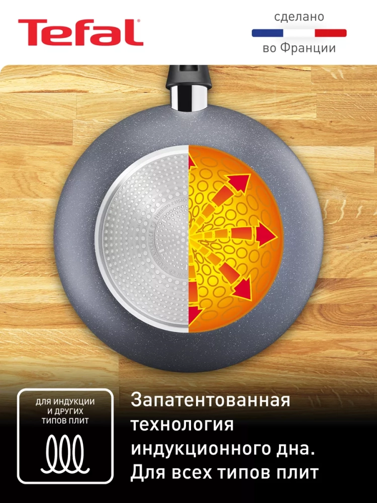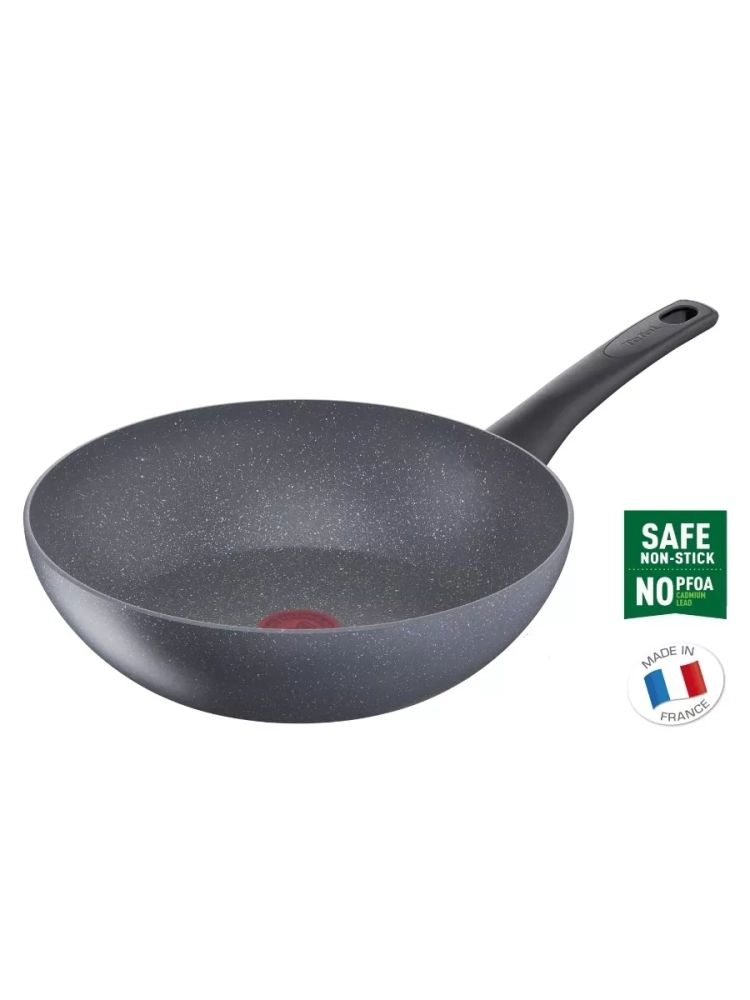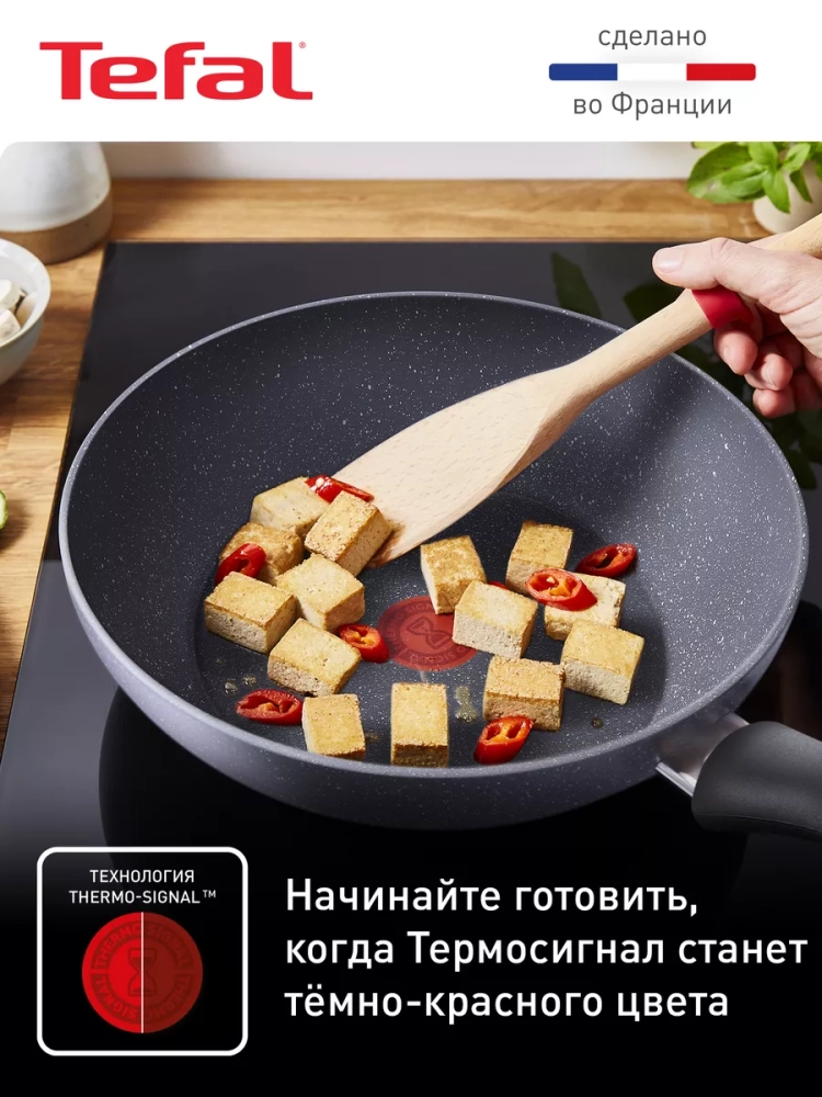 Главное преимущество глубокой алюминиевой сковороды – антипригарное покрытие Mineralia+, усиленное минеральными частицами, что обеспечивает долговечность и превосходные антипригарные свойства, даже при жарке без масла, вы получите качественный результат. Кроме того, покрытие кухонного инвентаря абсолютно безопасно, так как производится без добавления PFOA, свинца и кадмия. Большая сковородка Тефаль с высокими бортами оснащена инновационным индикатором температуры Thermo-Signal, который подскажет оптимальный момент для начала готовки, гарантируя идеальную текстуру и аппетитный внешний вид блюд, а индукционное дно Thermo-Fusion быстро и равномерно нагревает стенки по всей поверхности. Края посуды для дома имеют специальную форму для комфортного и точного слива лишней жидкости без брызг.