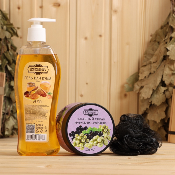 Скраб "Крыжовник-смородина" 320 мл, гель для душа "Мёд" 420 мл + мочалка