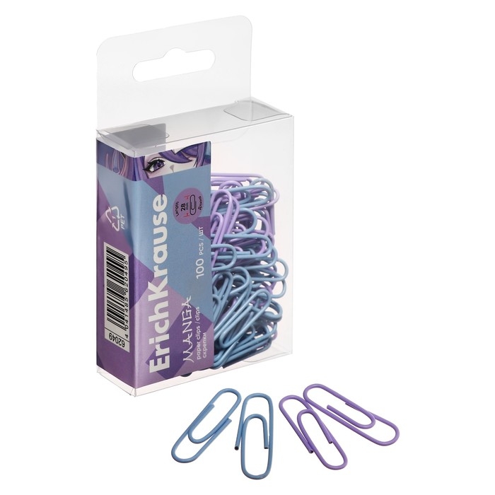 Скрепки канцелярские 28 мм, 100 штук, ErichKrause Manga, цветные с виниловым покрытием, пластиковая коробка, МИКС