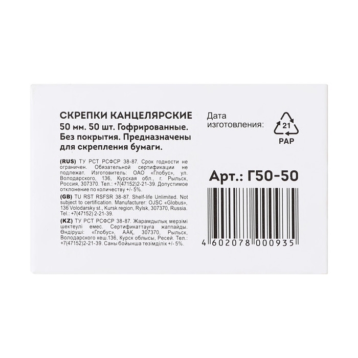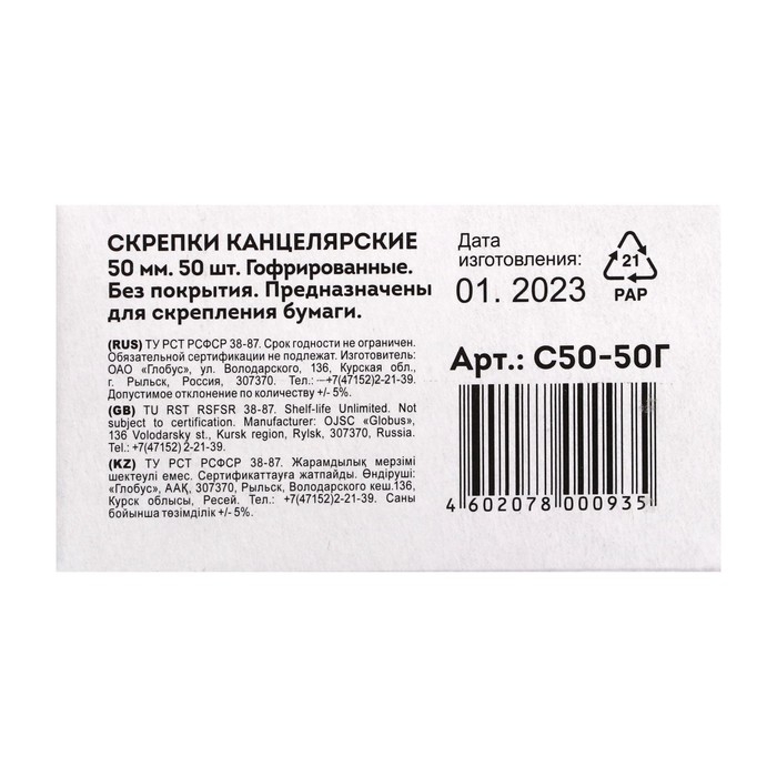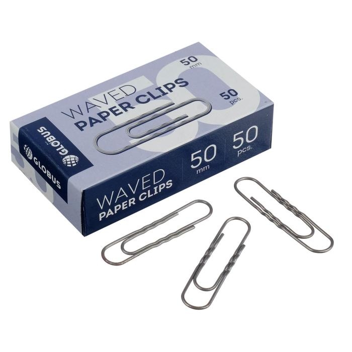 Скрепки канцелярские GLOBUS, 50 шт., 50 мм, без покрытия, гофрированные