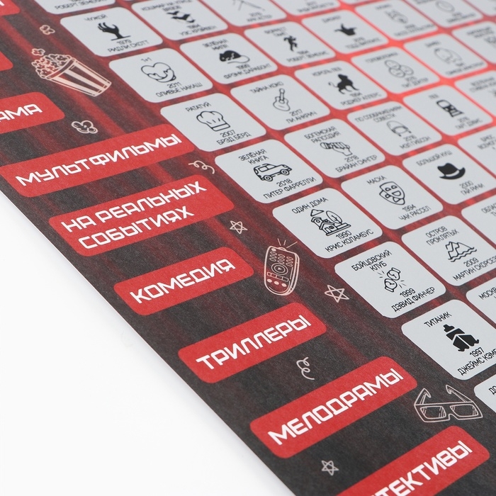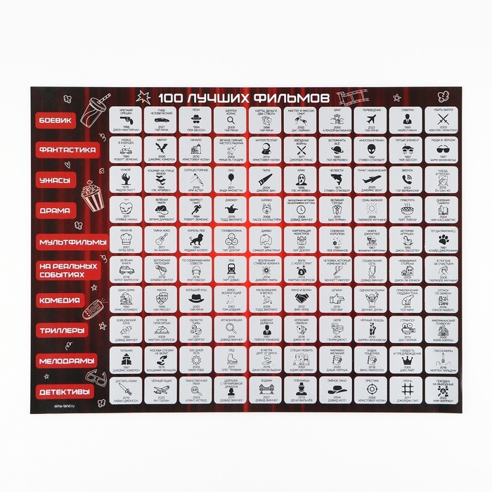 Это чек-лист лучших фильмов в 10 разнообразных жанрах, так что вы всегда будете находить что посмотреть. После просмотра каждого фильма вы можете стереть его с помощью специального штихеля. Это не только отличный способ следить за вашими кинематографическими предпочтениями, но и способ выбрать следующий фильм для просмотра.