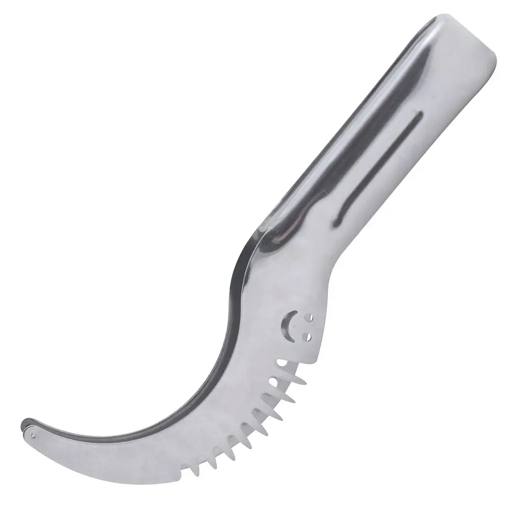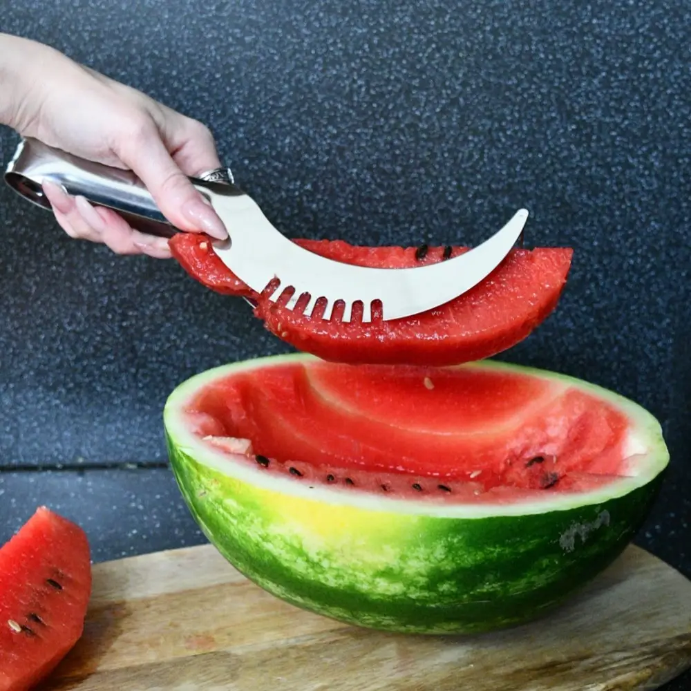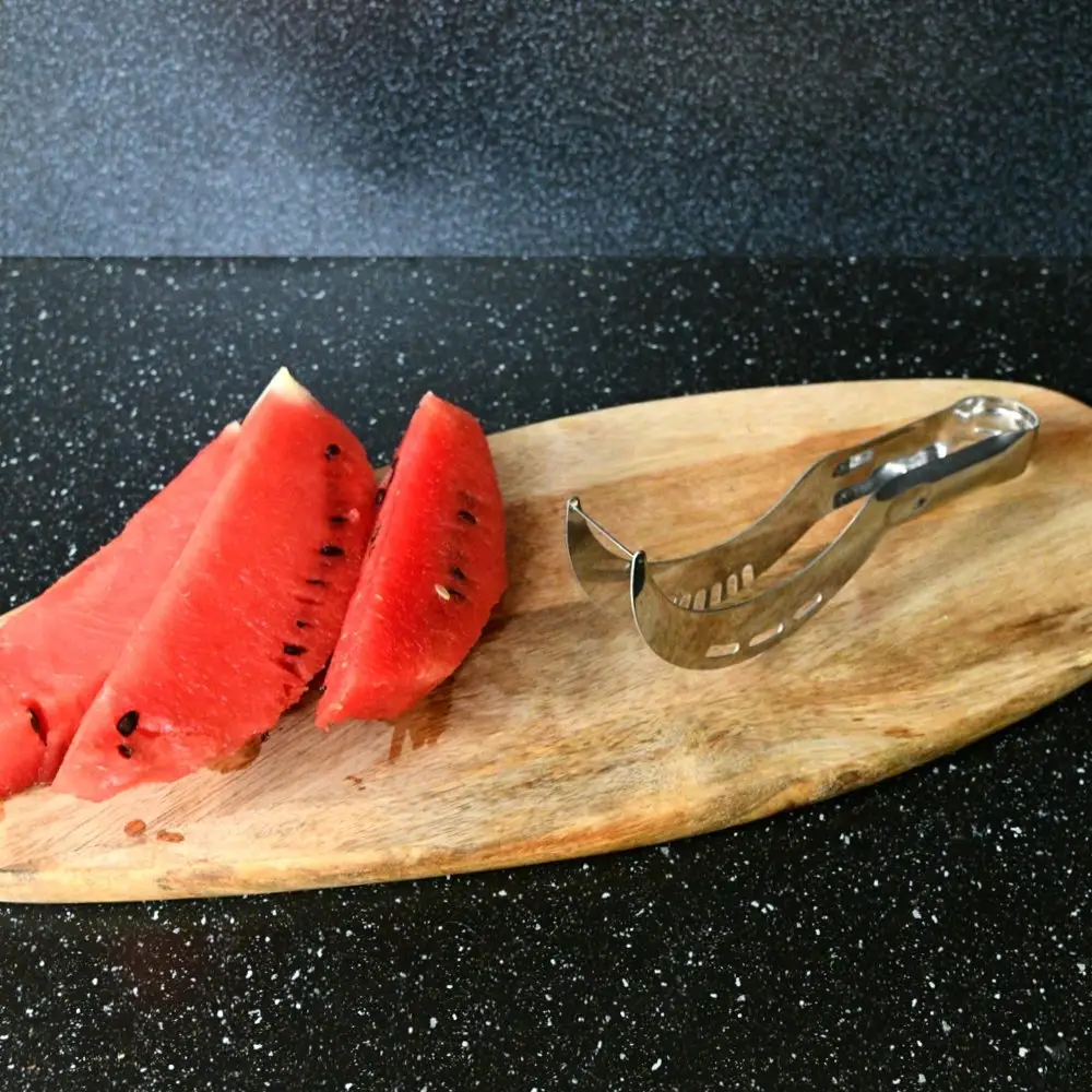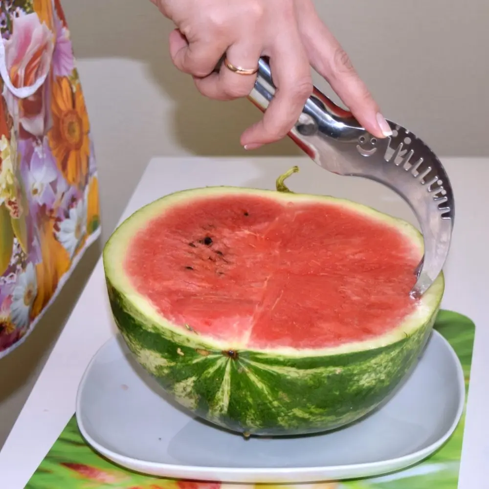 Уникальная конструкция слайсера позволит быстро и аккуратно порезать арбуз на ровные и одинаковые по толщине ломтики. С помощью слайсера вы извлечете только самую вкусную часть арбуза — мякоть. Приспособление служит еще и щипцами, с помощью которых можно захватить порезанные ломтики и перенести их на тарелку. Изделием просто пользоваться, гораздо удобнее, чем нарезать ломтики ножом. Сервируйте стол этой ароматным арбузом быстро, красиво и аккуратно! Длина 23,5 см. Изготовлено из коррозионностойкой (нержавеющей) стали.