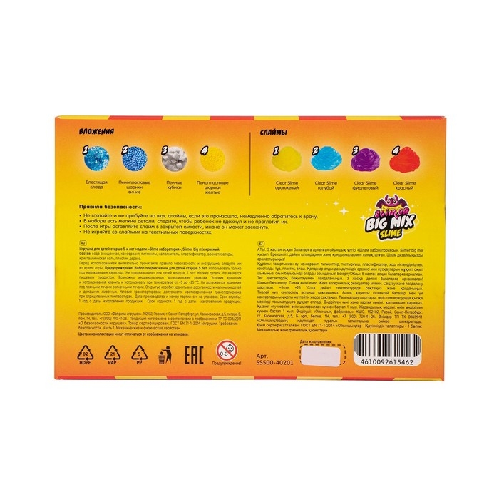 Слайм лаборатория «Slimer big mix» — это отличный способ разнообразить досуг детей, способствовать их развитию и подарить им много радости и веселья. Смешивайте, экспериментируйте и наслаждайтесь процессом создания новых уникальных слаймов!