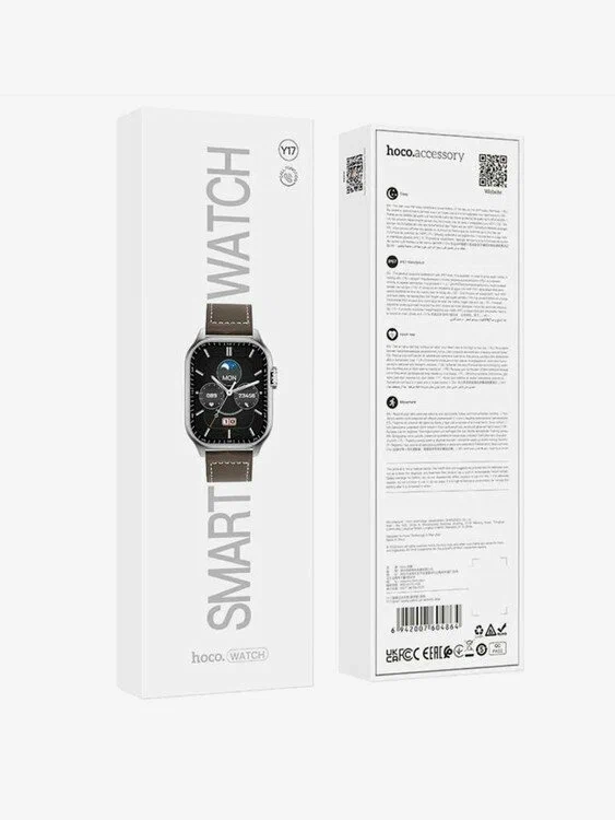 Смарт-часы HOCO Y 17 черные — это стильный и функциональный аксессуар, который станет незаменимым помощником в повседневной жизни. Эти умные часы не только обладают современным дизайном, но и оснащены множеством полезных функций для активных пользователей. Водонепроницаемость IP67: смарт-часы можно носить в любых условиях — они защищены от воздействия воды и пыли, что делает их идеальными для ежедневного использования и активного отдыха. Качественный браслет из кожи: обеспечивает комфортное прилегание к руке и долговечность, придавая часам элегантный вид. Это сочетание стиля и удобства. Прочный металлический циферблат и закаленное стекло: защищают экран от повреждений и делают смарт-часы устойчивыми к внешним воздействиям. Ширина циферблата 5 см позволяет легко читать время и уведомления. Сенсорный экран с диагональю 2,03 дюйма и разрешением 240x296 пикселей:яркий и четкий экран позволяет комфортно взаимодействовать с часами и просматривать уведомления и данные. Мощный процессор Realtek 8762DT и 128 МБ оперативной памяти обеспечивают плавную работу устройства, позволяя вам использовать различные функции без задержек. Поддержка Bluetooth 3.0/5.0 и возможность звонков с часов делают их не только удобным инструментом для уведомлений, но и средством связи. Долгий срок службы батареи:с батареей на 300 мАч смарт-часы работают до 5 дней с двойным Bluetooth или до 15 дней с одним Bluetooth,что гарантирует надежную работу в течение длительного времени. Функции для здоровья и фитнеса:смарт-часы поддерживают мониторинг частоты сердечных сокращений, физические упражнения, отслеживание сна, а также функцию для здоровья женщин. Поддержка 22 языков, включая русский, английский, арабский, испанский и многие другие, делает эти часы доступными для пользователей по всему миру. Смарт-часы HOCO Y 17 черные-это идеальное сочетание стиля, функциональности и удобства. Они подойдут для тех, кто ценит современные технологии и хочет следить за своим здоровьем и активностью, не жертвуя стилем.