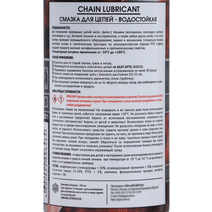 Смазка для цепи АГАТ Silverline предназначена для смазывания приводных цепей мото- (вело-) техники (мотоциклов, снегоходов, скутеров, велосипедов и т.д.), бытовой техники и инструментов, а также любых других цепей, в том числе цепных приводов промышленного оборудования, машин и механизмов. Специальная базовая литиевая основа и синтетическая присадка на ультрадисперсном порошке PTFE (тефлон) придают продукту высокие антифрикционные и противоизносные свойства.