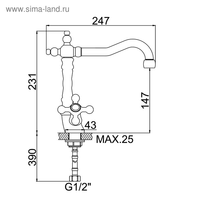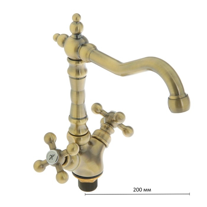 Смеситель оснащён высоким изливом и двумя вентильными рычагами. Подводка дополнена гайкой из латуни, что позволяет осуществить герметичный монтаж к системе водоснабжения.