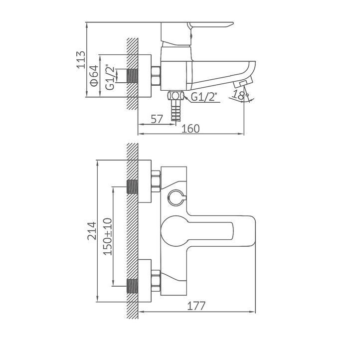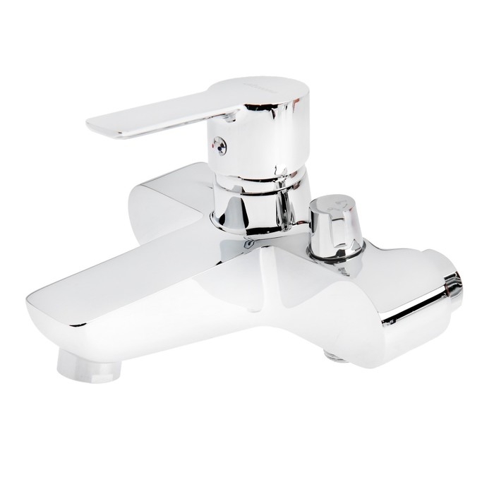 Компактный смеситель изготовлен из прочного материала — латуни. Настенная сантехника имеет короткий излив и рычаг для регулирования подачи воды.